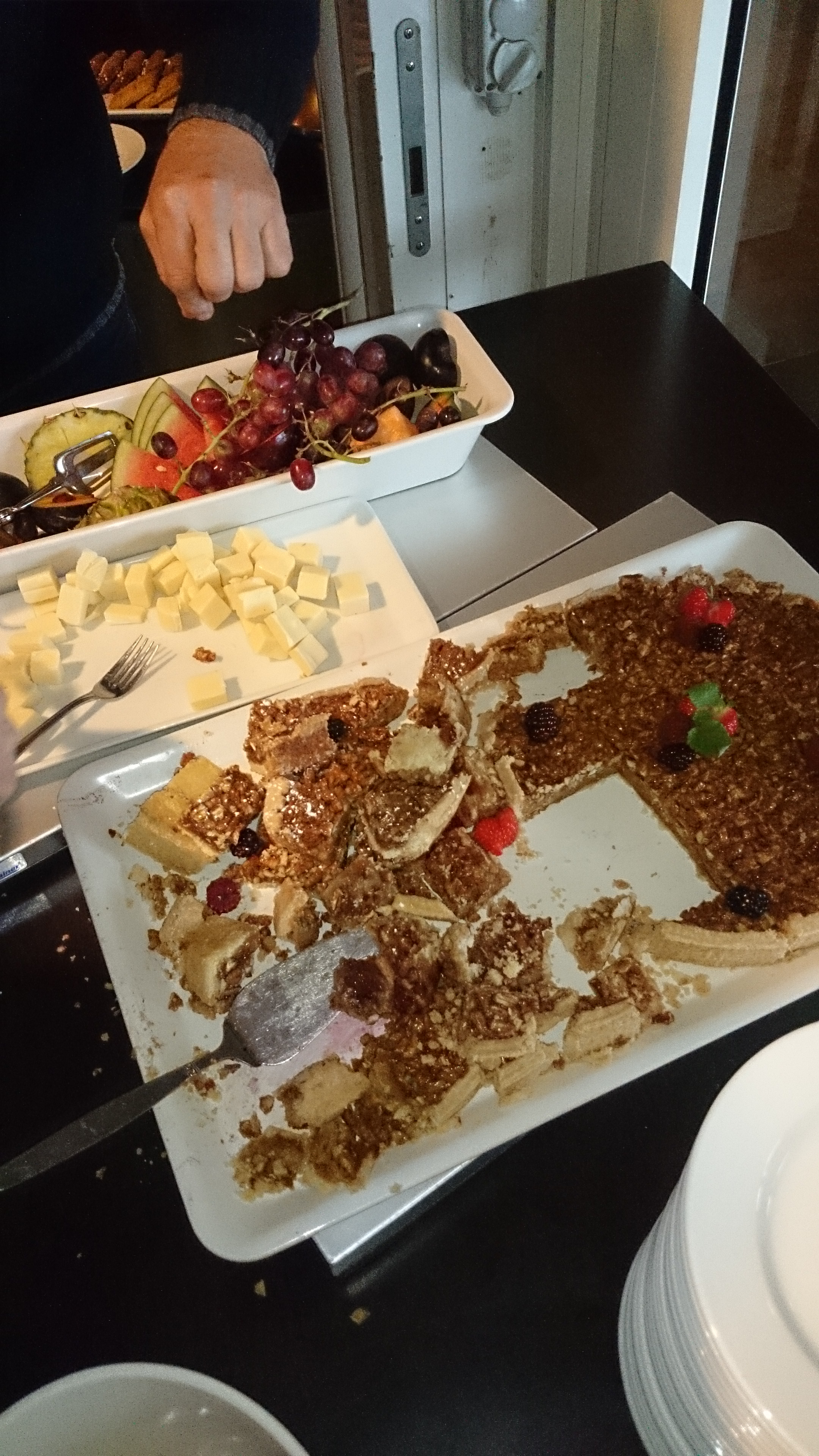 Väl framme vimsar vi först runt lite och hälsar på klubbkompisar innan vi slår oss ner på golvet. Jag har ingen koll på tiden och jag är ordentligt trött. Jag får uppdraget att hämta kartorna medan de andra förbereder sig. Jag tror att jag borde vara hungrig trots de två burgare vi köpte på vägen strax innan. Arrangören har en liten cafeteria så jag köper en av varje sort och klämmer i mej jättesnabbt. När jag ska ta den sista kakan upptäcker jag att jag visst redan ätit upp den. Jag är ohyggligt trött inför starten och har stora problem att fokusera på något, men jag får förtroendet att orientera på en av de fyra kartorna vilket stärker mig.